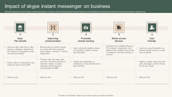 This slide depicts the impact of Skype instant messenger on business, and it includes easy file sharing, improving communications, promoting remote working, working across devices, and easy use. Do you have an important presentation coming up Are you looking for something that will make your presentation stand out from the rest Look no further than Impact Of Skype Instant Messenger On Business Video Conferencing In Corporate Microsoft Pdf. With our professional designs, you can trust that your presentation will pop and make delivering it a smooth process. And with Slidegeeks, you can trust that your presentation will be unique and memorable. So why wait Grab Impact Of Skype Instant Messenger On Business Video Conferencing In Corporate Microsoft Pdf today and make your presentation stand out from the rest. This slide depicts the impact of Skype instant messenger on business, and it includes easy file sharing, improving communications, promoting remote working, working across devices, and easy use.