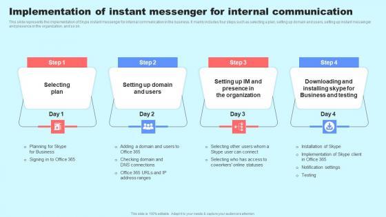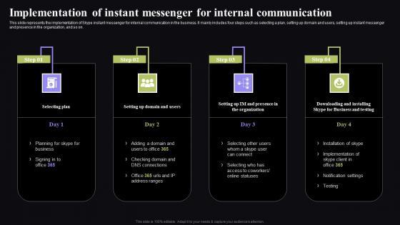 This slide represents the implementation of Skype instant messenger for internal communication in the business. It mainly includes four steps such as selecting a plan, setting up domain and users, setting up instant messenger and presence in the organization, and so on. Are you in need of a template that can accommodate all of your creative concepts This one is crafted professionally and can be altered to fit any style. Use it with Google Slides or PowerPoint. Include striking photographs, symbols, depictions, and other visuals. Fill, move around, or remove text boxes as desired. Test out color palettes and font mixtures. Edit and save your work, or work with colleagues. Download Implementation Of Instant Messenger For Internal Video Conferencing In Corporate Formats Pdf and observe how to make your presentation outstanding. Give an impeccable presentation to your group and make your presentation unforgettable. This slide represents the implementation of Skype instant messenger for internal communication in the business. It mainly includes four steps such as selecting a plan, setting up domain and users, setting up instant messenger and presence in the organization, and so on.