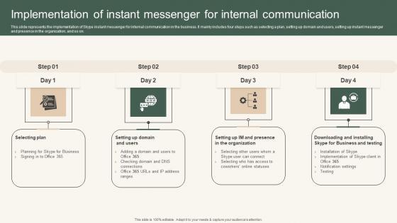 This slide represents the implementation of Skype instant messenger for internal communication in the business. It mainly includes four steps such as selecting a plan, setting up domain and users, setting up instant messenger and presence in the organization, and so on. Make sure to capture your audiences attention in your business displays with our gratis customizable Role Of IT In Business Communication Implementation Of Instant Messenger For Internal Structure PDF. These are great for business strategies, office conferences, capital raising or task suggestions. If you desire to acquire more customers for your tech business and ensure they stay satisfied, create your own sales presentation with these plain slides.