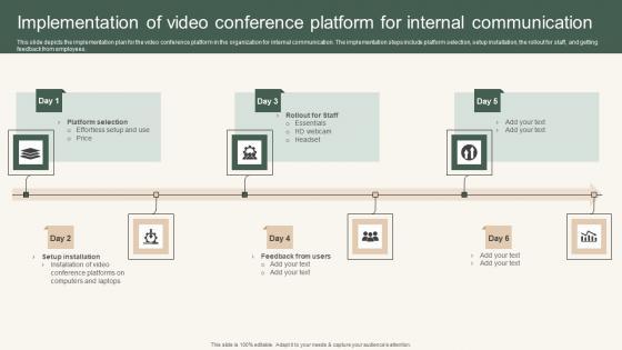 This slide depicts the implementation plan for the video conference platform in the organization for internal communication. The implementation steps include platform selection, setup installation, the rollout for staff, and getting feedback from employees. Slidegeeks has constructed Implementation Of Video Conference Instant Messenger For Internal Business Operations Summary Pdf after conducting extensive research and examination. These presentation templates are constantly being generated and modified based on user preferences and critiques from editors. Here, you will find the most attractive templates for a range of purposes while taking into account ratings and remarks from users regarding the content. This is an excellent jumping off point to explore our content and will give new users an insight into our top notch PowerPoint Templates. This slide depicts the implementation plan for the video conference platform in the organization for internal communication. The implementation steps include platform selection, setup installation, the rollout for staff, and getting feedback from employees.