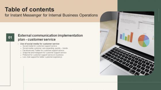 If you are looking for a format to display your unique thoughts, then the professionally designed Table Of Contents For Instant Messenger For Internal Business Operations Sample Pdf is the one for you. You can use it as a Google Slides template or a PowerPoint template. Incorporate impressive visuals, symbols, images, and other charts. Modify or reorganize the text boxes as you desire. Experiment with shade schemes and font pairings. Alter, share or cooperate with other people on your work. Download Table Of Contents For Instant Messenger For Internal Business Operations Sample Pdf and find out how to give a successful presentation. Present a perfect display to your team and make your presentation unforgettable. Our Table Of Contents For Instant Messenger For Internal Business Operations Sample Pdf are topically designed to provide an attractive backdrop to any subject. Use them to look like a presentation pro.