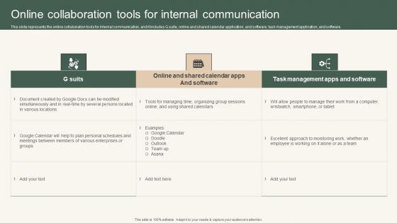 This slide represents the online collaboration tools for internal communication, and it includes G suite, online and shared calendar application, and software, task management application, and software. Slidegeeks is one of the best resources for PowerPoint templates. You can download easily and regulate Online Collaboration Tools For Instant Messenger For Internal Business Operations Brochure Pdf for your personal presentations from our wonderful collection. A few clicks is all it takes to discover and get the most relevant and appropriate templates. Use our Templates to add a unique zing and appeal to your presentation and meetings. All the slides are easy to edit and you can use them even for advertisement purposes. This slide represents the online collaboration tools for internal communication, and it includes G suite, online and shared calendar application, and software, task management application, and software.