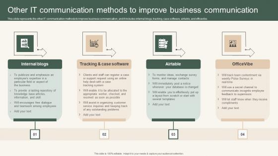 This slide represents the other IT communication methods to improve business communication, and it includes internal blogs, tracking, case software, airtable, and officevibe. Want to ace your presentation in front of a live audience Our Other It Communication Methods Instant Messenger For Internal Business Operations Formats Pdf can help you do that by engaging all the users towards you. Slidegeeks experts have put their efforts and expertise into creating these impeccable powerpoint presentations so that you can communicate your ideas clearly. Moreover, all the templates are customizable, and easy to edit and downloadable. Use these for both personal and commercial use. This slide represents the other IT communication methods to improve business communication, and it includes internal blogs, tracking, case software, airtable, and officevibe.