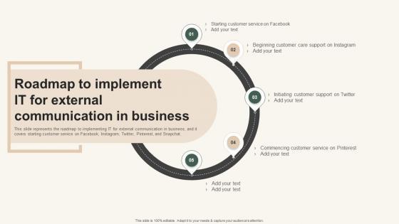 This slide represents the roadmap to implementing IT for external communication in business, and it covers starting customer service on Facebook, Instagram, Twitter, Pinterest, and Snapchat. From laying roadmaps to briefing everything in detail, our templates are perfect for you. You can set the stage with your presentation slides. All you have to do is download these easy to edit and customizable templates. Roadmap To Implement It For Instant Messenger For Internal Business Operations Mockup Pdf will help you deliver an outstanding performance that everyone would remember and praise you for. Do download this presentation today. This slide represents the roadmap to implementing IT for external communication in business, and it covers starting customer service on Facebook, Instagram, Twitter, Pinterest, and Snapchat.