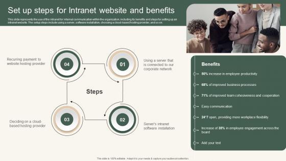 This slide represents the use of the intranet for internal communication within the organization, including its benefits and steps for setting up an intranet website. The setup steps include using a server, software installation, choosing a cloud based hosting provider, and so on. Present like a pro with Set Up Steps For Intranet Instant Messenger For Internal Business Operations Designs Pdf Create beautiful presentations together with your team, using our easy to use presentation slides. Share your ideas in real time and make changes on the fly by downloading our templates. So whether you are in the office, on the go, or in a remote location, you can stay in sync with your team and present your ideas with confidence. With Slidegeeks presentation got a whole lot easier. Grab these presentations today. This slide represents the use of the intranet for internal communication within the organization, including its benefits and steps for setting up an intranet website. The setup steps include using a server, software installation, choosing a cloud based hosting provider, and so on.