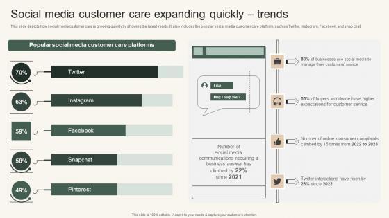 This slide depicts how social media customer care is growing quickly by showing the latest trends. It also includes the popular social media customer care platform, such as Twitter, Instagram, Facebook, and snap chat. Do you have an important presentation coming up Are you looking for something that will make your presentation stand out from the rest Look no further than Social Media Customer Care Instant Messenger For Internal Business Operations Portrait Pdf. With our professional designs, you can trust that your presentation will pop and make delivering it a smooth process. And with Slidegeeks, you can trust that your presentation will be unique and memorable. So why wait Grab Social Media Customer Care Instant Messenger For Internal Business Operations Portrait Pdf today and make your presentation stand out from the rest This slide depicts how social media customer care is growing quickly by showing the latest trends. It also includes the popular social media customer care platform, such as Twitter, Instagram, Facebook, and snap chat.