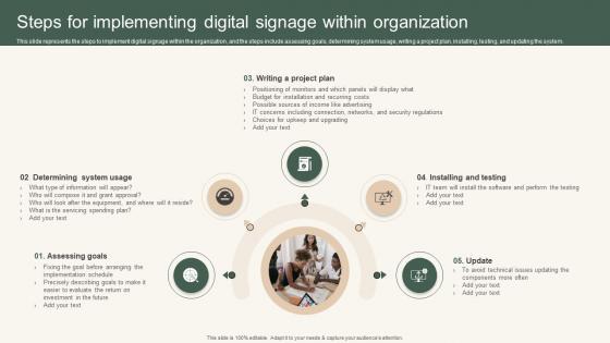 This slide represents the steps to implement digital signage within the organization, and the steps include assessing goals, determining system usage, writing a project plan, installing, testing, and updating the system. If your project calls for a presentation, then Slidegeeks is your go to partner because we have professionally designed, easy to edit templates that are perfect for any presentation. After downloading, you can easily edit Steps For Implementing Digital Instant Messenger For Internal Business Operations Microsoft Pdf and make the changes accordingly. You can rearrange slides or fill them with different images. Check out all the handy templates This slide represents the steps to implement digital signage within the organization, and the steps include assessing goals, determining system usage, writing a project plan, installing, testing, and updating the system.