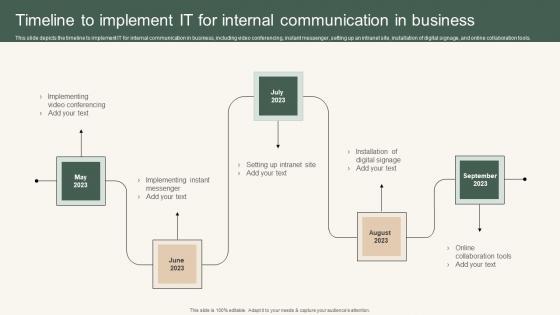 This slide depicts the timeline to implement IT for internal communication in business, including video conferencing, instant messenger, setting up an intranet site, installation of digital signage, and online collaboration tools. Are you in need of a template that can accommodate all of your creative concepts This one is crafted professionally and can be altered to fit any style. Use it with Google Slides or PowerPoint. Include striking photographs, symbols, depictions, and other visuals. Fill, move around, or remove text boxes as desired. Test out color palettes and font mixtures. Edit and save your work, or work with colleagues. Download Timeline To Implement It For Instant Messenger For Internal Business Operations Portrait Pdf and observe how to make your presentation outstanding. Give an impeccable presentation to your group and make your presentation unforgettable. This slide depicts the timeline to implement IT for internal communication in business, including video conferencing, instant messenger, setting up an intranet site, installation of digital signage, and online collaboration tools.