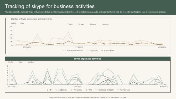 This slide depicts the tracking of Skype for business activities, and it covers organized activities such as instant message, audio, and video, file sharing, web, dial in and dial out third party, peer to peer sessions, and so on. Crafting an eye catching presentation has never been more straightforward. Let your presentation shine with this tasteful yet straightforward Tracking Of Skype For Business Instant Messenger For Internal Business Operations Ideas Pdf template. It offers a minimalistic and classy look that is great for making a statement. The colors have been employed intelligently to add a bit of playfulness while still remaining professional. Construct the ideal Tracking Of Skype For Business Instant Messenger For Internal Business Operations Ideas Pdf that effortlessly grabs the attention of your audience Begin now and be certain to wow your customers This slide depicts the tracking of Skype for business activities, and it covers organized activities such as instant message, audio, and video, file sharing, web, dial in and dial out third party, peer to peer sessions, and so on.