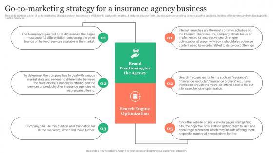 This slide provides a brief of go-to-marketing strategies which the company will follow to capture the market, it includes strategy for insurance agency marketing, to normalize the audience, holding offline events and window display to run the business. Whether you have daily or monthly meetings, a brilliant presentation is necessary. Go To Marketing Strategy For A Insurance Agency Insurance Business Plan Elements Pdf can be your best option for delivering a presentation. Represent everything in detail using Go To Marketing Strategy For A Insurance Agency Insurance Business Plan Elements Pdf nd make yourself stand out in meetings. The template is versatile and follows a structure that will cater to your requirements. All the templates prepared by Slidegeeks are easy to download and edit. Our research experts have taken care of the corporate themes as well. So, give it a try and see the results. This slide provides a brief of go-to-marketing strategies which the company will follow to capture the market, it includes strategy for insurance agency marketing, to normalize the audience, holding offline events and window display to run the business.