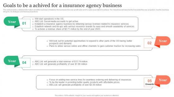 This slide provides a detailed information about the businesss milestone, the businesss five year growth plan and its sales assumption to achieve. The milestones will describe the forecasted five year projection, how the business will grow, its strategies and revenue projections. Find highly impressive Goals To Be A Achived For A Insurance Agency Insurance Business Plan Background Pdf on Slidegeeks to deliver a meaningful presentation. You can save an ample amount of time using these presentation templates. No need to worry to prepare everything from scratch because Slidegeeks experts have already done a huge research and work for you. You need to download Goals To Be A Achived For A Insurance Agency Insurance Business Plan Background Pdf for your upcoming presentation. All the presentation templates are 100 percent editable and you can change the color and personalize the content accordingly. Download now This slide provides a detailed information about the businesss milestone, the businesss five year growth plan and its sales assumption to achieve. The milestones will describe the forecasted five year projection, how the business will grow, its strategies and revenue projections.