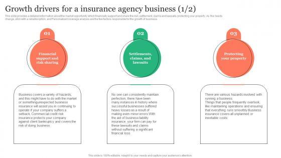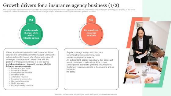 This slide provides a detailed information about the market opportunity which financially support and share the risk, settlement, claims and lawsuits, protecting your property, As the needs change, stick with a reliable option, and Personalized coverage analysis are the few factors responsible for the growth of business. If your project calls for a presentation, then Slidegeeks is your go-to partner because we have professionally designed, easy-to-edit templates that are perfect for any presentation. After downloading, you can easily edit Growth Drivers For A Insurance Agency Business Insurance Business Plan Professional Pdf and make the changes accordingly. You can rearrange slides or fill them with different images. Check out all the handy templates This slide provides a detailed information about the market opportunity which financially support and share the risk, settlement, claims and lawsuits, protecting your property, As the needs change, stick with a reliable option, and Personalized coverage analysis are the few factors responsible for the growth of business.
