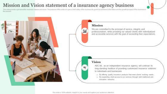 This slide provide a gist about the business mission and vision. The purpose of this slide is to give a brief outlay of the business its goal to be achieved in the future and the growth prospect of the business in the present. Explore a selection of the finest Mission And Vision Statement Of A Insurance Agency Insurance Business Plan Diagrams Pdf here. With a plethora of professionally designed and pre-made slide templates, you can quickly and easily find the right one for your upcoming presentation. You can use our Mission And Vision Statement Of A Insurance Agency Insurance Business Plan Diagrams Pdf to effectively convey your message to a wider audience. Slidegeeks has done a lot of research before preparing these presentation templates. The content can be personalized and the slides are highly editable. Grab templates today from Slidegeeks. This slide provide a gist about the business mission and vision. The purpose of this slide is to give a brief outlay of the business its goal to be achieved in the future and the growth prospect of the business in the present.