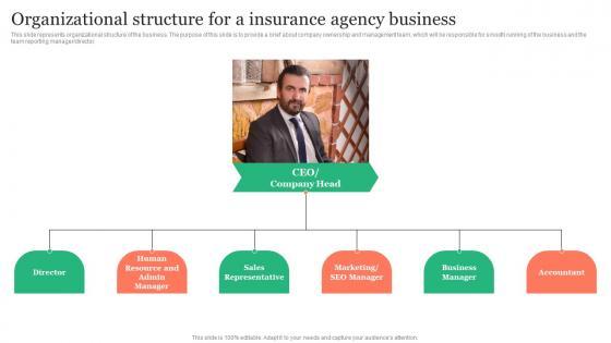 This slide represents organizational structure of the business. The purpose of this slide is to provide a brief about company ownership and management team, which will be responsible for smooth running of the business and the team reporting manager director. The best PPT templates are a great way to save time, energy, and resources. Slidegeeks have 100 percent editable powerpoint slides making them incredibly versatile. With these quality presentation templates, you can create a captivating and memorable presentation by combining visually appealing slides and effectively communicating your message. Download Organizational Structure For A Insurance Agency Insurance Business Plan Graphics Pdf from Slidegeeks and deliver a wonderful presentation. This slide represents organizational structure of the business. The purpose of this slide is to provide a brief about company ownership and management team, which will be responsible for smooth running of the business and the team reporting manager director.
