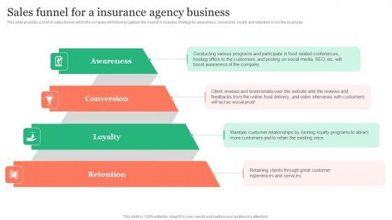 This slide provides a brief of sales funnel which the company will follow to capture the market, it includes strategy for awareness, conversion, loyalty and retention to run the business. Here you can discover an assortment of the finest PowerPoint and Google Slides templates. With these templates, you can create presentations for a variety of purposes while simultaneously providing your audience with an eye-catching visual experience. Download Sales Funnel For A Insurance Agency Business Insurance Business Plan Introduction Pdf to deliver an impeccable presentation. These templates will make your job of preparing presentations much quicker, yet still, maintain a high level of quality. Slidegeeks has experienced researchers who prepare these templates and write high-quality content for you. Later on, you can personalize the content by editing the Sales Funnel For A Insurance Agency Business Insurance Business Plan Introduction Pdf. This slide provides a brief of sales funnel which the company will follow to capture the market, it includes strategy for awareness, conversion, loyalty and retention to run the business.