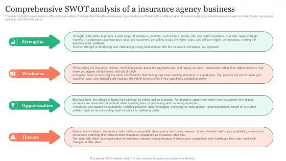 The slide highlights a swot analysis of the clothing business. It includes the strengths, weaknesses, opportunities, and threats of the clothing market. It helps in building on what company does well, and what it lacks, seizing new openings, and minimizing risks. Do you have to make sure that everyone on your team knows about any specific topic I yes, then you should give Comprehensive Swot Analysis Of A Insurance Agency Insurance Business Plan Diagrams Pdf a try. Our experts have put a lot of knowledge and effort into creating this impeccable Comprehensive Swot Analysis Of A Insurance Agency Insurance Business Plan Diagrams Pdf. You can use this template for your upcoming presentations, as the slides are perfect to represent even the tiniest detail. You can download these templates from the Slidegeeks website and these are easy to edit. So grab these today The slide highlights a swot analysis of the clothing business. It includes the strengths, weaknesses, opportunities, and threats of the clothing market. It helps in building on what company does well, and what it lacks, seizing new openings, and minimizing risks.