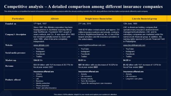 This slide provides a competitive framework of insurance brand competitive analysis within the already existing market in the USA along with there brief description and products offered by each company There are so many reasons you need a Competitive Analysis A Detailed Insurance Broker Business Plan Demonstration Pdf The first reason is you can not spend time making everything from scratch, Thus, Slidegeeks has made presentation templates for you too. You can easily download these templates from our website easily. This slide provides a competitive framework of insurance brand competitive analysis within the already existing market in the USA along with there brief description and products offered by each company