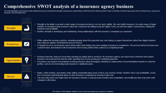 The slide highlights a swot analysis of the clothing business. It includes the strengths, weaknesses, opportunities, and threats of the clothing market. It helps in building on what company does well, and what it lacks, seizing new openings, and minimizing risks Do you have to make sure that everyone on your team knows about any specific topic I yes, then you should give Comprehensive Swot Analysis Of A Insurance Agency Insurance Broker Business Plan Elements Pdf a try. Our experts have put a lot of knowledge and effort into creating this impeccable Comprehensive Swot Analysis Of A Insurance Agency Insurance Broker Business Plan Elements Pdf You can use this template for your upcoming presentations, as the slides are perfect to represent even the tiniest detail. You can download these templates from the Slidegeeks website and these are easy to edit. So grab these today. The slide highlights a swot analysis of the clothing business. It includes the strengths, weaknesses, opportunities, and threats of the clothing market. It helps in building on what company does well, and what it lacks, seizing new openings, and minimizing risks