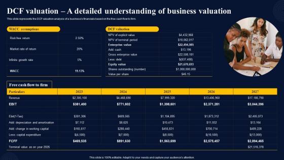 This slide represents the DCF valuation analysis of a businesss financials based on the free cash flow to firm.Get a simple yet stunning designed DCF Valuation A Detailed Understanding Of Business Insurance Broker Business Plan Information Pdf It is the best one to establish the tone in your meetings. It is an excellent way to make your presentations highly effective. So, download this PPT today from Slidegeeks and see the positive impacts. Our easy-to-edit DCF Valuation A Detailed Understanding Of Business Insurance Broker Business Plan Information Pdf can be your go-to option for all upcoming conferences and meetings. So, what are you waiting for Grab this template today. This slide represents the DCF valuation analysis of a businesss financials based on the free cash flow to firm.