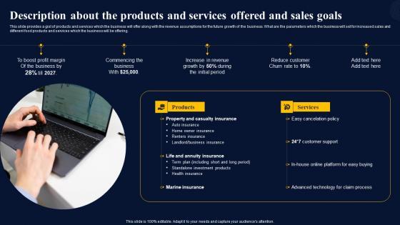 This slide provides a gist of products and services which the business will offer along with the revenue assumptions for the future growth of the business. What are the parameters which the business will set for increased sales and different food products and services which the business will be offering.From laying roadmaps to briefing everything in detail, our templates are perfect for you. You can set the stage with your presentation slides. All you have to do is download these easy-to-edit and customizable templates. Description About The Products And Services Insurance Broker Business Plan Topics Pdf will help you deliver an outstanding performance that everyone would remember and praise you for. Do download this presentation today. This slide provides a gist of products and services which the business will offer along with the revenue assumptions for the future growth of the business. What are the parameters which the business will set for increased sales and different food products and services which the business will be offering.