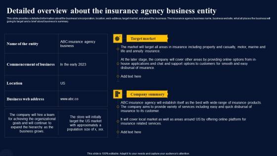 This slide provides a detailed information about the businesss incorporation, location, web-address, target market, and about the business. The insurance agency business name, business website, what all places the business will going to target and a brief about businesss summary.Present like a pro with Detailed Overview About The Insurance Agency Insurance Broker Business Plan Structure Pdf Create beautiful presentations together with your team, using our easy-to-use presentation slides. Share your ideas in real-time and make changes on the fly by downloading our templates. So whether you are in the office, on the go, or in a remote location, you can stay in sync with your team and present your ideas with confidence. With Slidegeeks presentation got a whole lot easier. Grab these presentations today. This slide provides a detailed information about the businesss incorporation, location, web address, target market, and about the business. The insurance agency business name, business website, what all places the business will going to target and a brief about businesss summary.