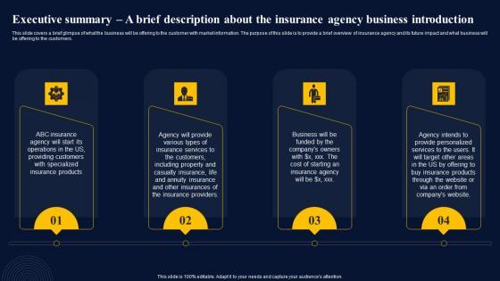 This slide covers a brief glimpse of what the business will be offering to the customer with market information. The purpose of this slide is to provide a brief overview of insurance agency and its future impact and what business will be offering to the customers.Slidegeeks is here to make your presentations a breeze with Executive Summary A Brief Description About The Insurance Broker Business Plan Guidelines Pdf With our easy-to-use and customizable templates, you can focus on delivering your ideas rather than worrying about formatting. With a variety of designs to choose from, you are sure to find one that suits your needs. And with animations and unique photos, illustrations, and fonts, you can make your presentation pop. So whether you are giving a sales pitch or presenting to the board, make sure to check out Slidegeeks first. This slide covers a brief glimpse of what the business will be offering to the customer with market information. The purpose of this slide is to provide a brief overview of insurance agency and its future impact and what business will be offering to the customers.