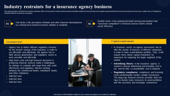 This slide provides a brief gist of industry restraints of the US insurance market, which includes restraints related to licensure laws and capital requirements in the insurance business, thus to have a better view of obligations available with the insurance companies.Are you in need of a template that can accommodate all of your creative concepts This one is crafted professionally and can be altered to fit any style. Use it with Google Slides or PowerPoint. Include striking photographs, symbols, depictions, and other visuals. Fill, move around, or remove text boxes as desired. Test out color palettes and font mixtures. Edit and save your work, or work with colleagues. Download Industry Restraints For A Insurance Broker Business Plan Demonstration Pdf and observe how to make your presentation outstanding. Give an impeccable presentation to your group and make your presentation unforgettable. This slide provides a brief gist of industry restraints of the US insurance market, which includes restraints related to licensure laws and capital requirements in the insurance business, thus to have a better view of obligations available with the insurance companies.