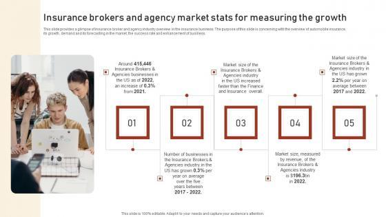 This slide provides a glimpse of insurance broker and agency industry overview in the insurance business. The purpose of this slide is concerning with the overview of automobile insurance, its growth, demand and its forecasting in the market, the success rate and enhancement of business. Want to ace your presentation in front of a live audience Our Insurance Brokers And Agency Market Stats For Measuring Building An Insurance Company Structure Pdf can help you do that by engaging all the users towards you. Slidegeeks experts have put their efforts and expertise into creating these impeccable powerpoint presentations so that you can communicate your ideas clearly. Moreover, all the templates are customizable, and easy-to-edit and downloadable. Use these for both personal and commercial use. This slide provides a glimpse of insurance broker and agency industry overview in the insurance business. The purpose of this slide is concerning with the overview of automobile insurance, its growth, demand and its forecasting in the market, the success rate and enhancement of business.