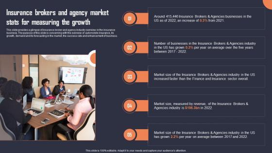 This slide provides a glimpse of insurance broker and agency industry overview in the insurance business. The purpose of this slide is concerning with the overview of automobile insurance, its growth, demand and its forecasting in the market, the success rate and enhancement of business. Welcome to our selection of the Insurance Brokers And Agency Market Stats For Measuring Assurant Insurance Agency Infographics Pdf. These are designed to help you showcase your creativity and bring your sphere to life. Planning and Innovation are essential for any business that is just starting out. This collection contains the designs that you need for your everyday presentations. All of our PowerPoints are 100 percent editable, so you can customize them to suit your needs. This multi-purpose template can be used in various situations. Grab these presentation templates today. This slide provides a glimpse of insurance broker and agency industry overview in the insurance business. The purpose of this slide is concerning with the overview of automobile insurance, its growth, demand and its forecasting in the market, the success rate and enhancement of business.