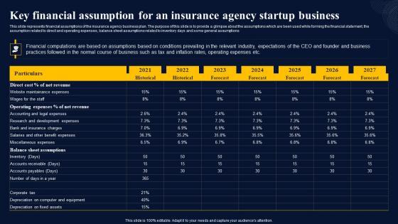 This slide represents financial assumptions of the insurance agency business plan. The purpose of this slide is to provide a glimpse about the assumptions which are been used while forming the financial statement, the assumption related to direct and operating expenses, balance sheet assumptions related to inventory days and some general assumptions.Make sure to capture your audiences attention in your business displays with our gratis customizable Key Financial Assumption For An Insurance Broker Business Plan Guidelines Pdf These are great for business strategies, office conferences, capital raising or task suggestions. If you desire to acquire more customers for your tech business and ensure they stay satisfied, create your own sales presentation with these plain slides. This slide represents financial assumptions of the insurance agency business plan. The purpose of this slide is to provide a glimpse about the assumptions which are been used while forming the financial statement, the assumption related to direct and operating expenses, balance sheet assumptions related to inventory days and some general assumptions.