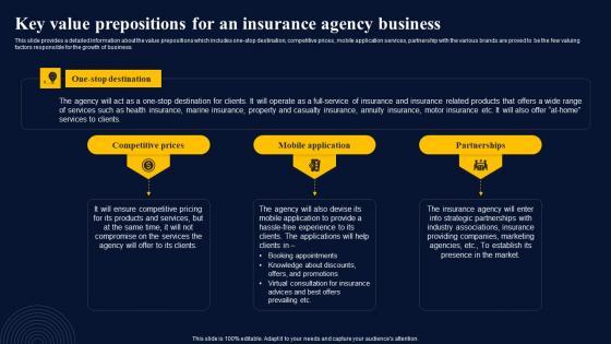 This slide provides a detailed information about the value prepositions which includes one-stop destination, competitive prices, mobile application services, partnership with the various brands are proved to be the few valuing factors responsible for the growth of business.Coming up with a presentation necessitates that the majority of the effort goes into the content and the message you intend to convey. The visuals of a PowerPoint presentation can only be effective if it supplements and supports the story that is being told. Keeping this in mind our experts created Key Value Prepositions For An Insurance Agency Business Insurance Broker Business Plan Ideas Pdf to reduce the time that goes into designing the presentation. This way, you can concentrate on the message while our designers take care of providing you with the right template for the situation. This slide provides a detailed information about the value prepositions which includes one stop destination, competitive prices, mobile application services, partnership with the various brands are proved to be the few valuing factors responsible for the growth of business.