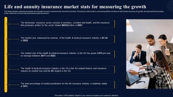 This slide provides a glimpse of property and casualty insurance overview in the insurance business. The purpose of this slide is concerning with the overview of automobile insurance, its growth, demand and its forecasting in the market, the success rate and enhancement of business.This modern and well-arranged Life And Annuity Insurance Market Stats For Insurance Broker Business Plan Designs Pdf provides lots of creative possibilities. It is very simple to customize and edit with the Powerpoint Software. Just drag and drop your pictures into the shapes. All facets of this template can be edited with Powerpoint no extra software is necessary. Add your own material, put your images in the places assigned for them, adjust the colors, and then you can show your slides to the world, with an animated slide included. This slide provides a glimpse of property and casualty insurance overview in the insurance business. The purpose of this slide is concerning with the overview of automobile insurance, its growth, demand and its forecasting in the market, the success rate and enhancement of business.