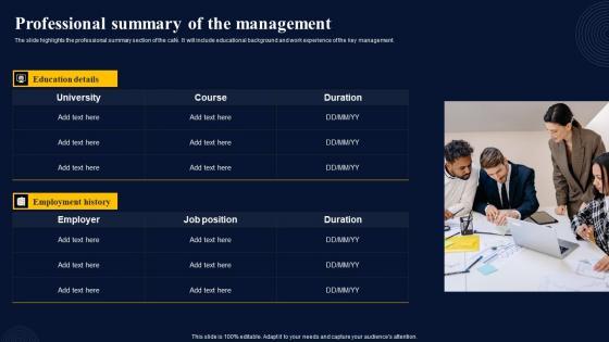 The slide highlights the professional summary section of the cafe. It will include educational background and work experience of the key management.Are you searching for a Professional Summary Of The Management Insurance Broker Business Plan Microsoft Pdf that is uncluttered, straightforward, and original Its easy to edit, and you can change the colors to suit your personal or business branding. For a presentation that expresses how much effort you have put in, this template is ideal. With all of its features, including tables, diagrams, statistics, and lists, its perfect for a business plan presentation. Make your ideas more appealing with these professional slides. Download Professional Summary Of The Management Insurance Broker Business Plan Microsoft Pdf from Slidegeeks today. The slide highlights the professional summary section of the cafe. It will include educational background and work experience of the key management.