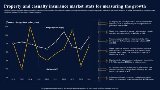 This slide provides a glimpse of property and casualty insurance overview in the insurance business. The purpose of this slide is concerning with the overview of automobile insurance, its growth, demand and its forecasting in the market, the success rate and enhancement of business.Slidegeeks has constructed Property And Casualty Insurance Market Stats For Insurance Broker Business Plan Template Pdf after conducting extensive research and examination. These presentation templates are constantly being generated and modified based on user preferences and critiques from editors. Here, you will find the most attractive templates for a range of purposes while taking into account ratings and remarks from users regarding the content. This is an excellent jumping-off point to explore our content and will give new users an insight into our top-notch PowerPoint Templates. This slide provides a glimpse of property and casualty insurance overview in the insurance business. The purpose of this slide is concerning with the overview of automobile insurance, its growth, demand and its forecasting in the market, the success rate and enhancement of business.
