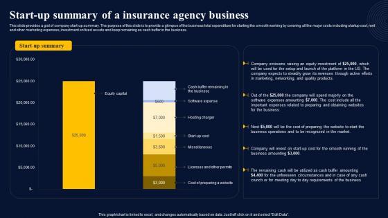 This slide provides a gist of company start-up summary. The purpose of this slide is to provide a glimpse of the business total expenditure for starting the smooth working by covering all the major costs including startup cost, rent and other marketing expenses, investment on fixed assets and keep remaining as cash buffer in the business.Do you know about Slidesgeeks Start Up Summary Of A Insurance Agency Business Insurance Broker Business Plan Microsoft Pdf These are perfect for delivering any kind od presentation. Using it, create PowerPoint presentations that communicate your ideas and engage audiences. Save time and effort by using our pre-designed presentation templates that are perfect for a wide range of topic. Our vast selection of designs covers a range of styles, from creative to business, and are all highly customizable and easy to edit. Download as a PowerPoint template or use them as Google Slides themes. This slide provides a gist of company start up summary. The purpose of this slide is to provide a glimpse of the business total expenditure for starting the smooth working by covering all the major costs including startup cost, rent and other marketing expenses, investment on fixed assets and keep remaining as cash buffer in the business.