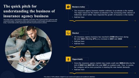This slide covers a brief glimpse of what the quick pitch of the business to the customers with market information. The purpose of this slide is to provide a brief insights about the business today, market stats and the opportunity which the business have to achieve. If you are looking for a format to display your unique thoughts, then the professionally designed The Quick Pitch For Understanding The Business Insurance Broker Business Plan Diagrams Pdf is the one for you. You can use it as a Google Slides template or a PowerPoint template. Incorporate impressive visuals, symbols, images, and other charts. Modify or reorganize the text boxes as you desire. Experiment with shade schemes and font pairings. Alter, share or cooperate with other people on your work. Download The Quick Pitch For Understanding The Business Insurance Broker Business Plan Diagrams Pdf and find out how to give a successful presentation. Present a perfect display to your team and make your presentation unforgettable. This slide covers a brief glimpse of what the quick pitch of the business to the customers with market information. The purpose of this slide is to provide a brief insights about the business today, market stats and the opportunity which the business have to achieve.