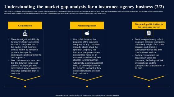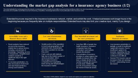 This slide highlights the market gap which the industry is undergoing which includes Accessibility issues and a financial literacy deficit, low rate of penetration, poor household investment, inadequate financial investments, discounts and competition and limited sources for financing, competition, mismanagement and too much politicization in the insurance sector.Find a pre-designed and impeccable Understanding The Market Gap Analysis For Insurance Broker Business Plan Summary Pdf The templates can ace your presentation without additional effort. You can download these easy-to-edit presentation templates to make your presentation stand out from others. So, what are you waiting for Download the template from Slidegeeks today and give a unique touch to your presentation. This slide highlights the market gap which the industry is undergoing which includes Accessibility issues and a financial literacy deficit, low rate of penetration, poor household investment, inadequate financial investments, discounts and competition and limited sources for financing, competition, mismanagement and too much politicization in the insurance sector.