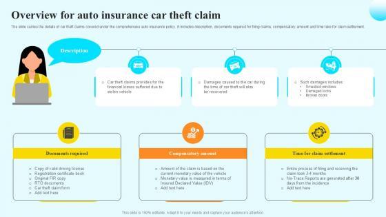 The slide carries the details of car theft claims covered under the comprehensive auto insurance policy. It includes description, documents required for filing claims, compensatory amount and time take for claim settlement. Presenting this PowerPoint presentation, titled Overview For Auto Insurance Steps By Step Guide For Claiming Car PPT Presentation, with topics curated by our researchers after extensive research. This editable presentation is available for immediate download and provides attractive features when used. Download now and captivate your audience. Presenting this Overview For Auto Insurance Steps By Step Guide For Claiming Car PPT Presentation. Our researchers have carefully researched and created these slides with all aspects taken into consideration. This is a completely customizable Overview For Auto Insurance Steps By Step Guide For Claiming Car PPT Presentation that is available for immediate downloading. Download now and make an impact on your audience. Highlight the attractive features available with our PPTs. The slide carries the details of car theft claims covered under the comprehensive auto insurance policy. It includes description, documents required for filing claims, compensatory amount and time take for claim settlement.