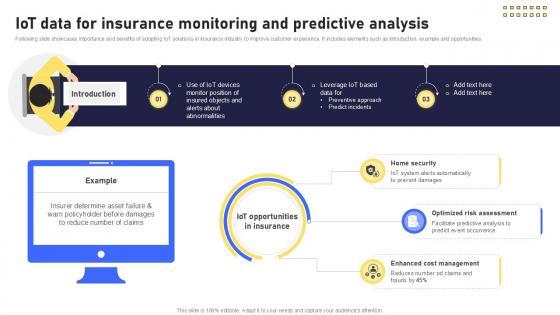 Following slide showcases importance and benefits of adopting IoT solutions in insurance industry to improve customer experience. It includes elements such as introduction, example and opportunities. Whether you have daily or monthly meetings, a brilliant presentation is necessary. IoT Data For Insurance Monitoring And Predictive Analysis IoT In Banking For Digital Future IoT SS V can be your best option for delivering a presentation. Represent everything in detail using IoT Data For Insurance Monitoring And Predictive Analysis IoT In Banking For Digital Future IoT SS V and make yourself stand out in meetings. The template is versatile and follows a structure that will cater to your requirements. All the templates prepared by Slidegeeks are easy to download and edit. Our research experts have taken care of the corporate themes as well. So, give it a try and see the results. Following slide showcases importance and benefits of adopting IoT solutions in insurance industry to improve customer experience. It includes elements such as introduction, example and opportunities.