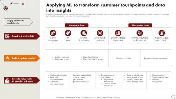 This slide outlines use of machine learning to gain insights from data and touchpoints in client journey across insurance industry. Showcases application of analytics to acquire and enrich data, build and update models ad provide value with AI enabled solutions. Do you have an important presentation coming up Are you looking for something that will make your presentation stand out from the rest Look no further than Technology Trends In Online Insurance Applying Ml To Transform Customer Touchpoints And Data. With our professional designs, you can trust that your presentation will pop and make delivering it a smooth process. And with Slidegeeks, you can trust that your presentation will be unique and memorable. So why wait Grab Technology Trends In Online Insurance Applying Ml To Transform Customer Touchpoints And Data today and make your presentation stand out from the rest. This slide outlines use of machine learning to gain insights from data and touchpoints in client journey across insurance industry. Showcases application of analytics to acquire and enrich data, build and update models ad provide value with AI enabled solutions.