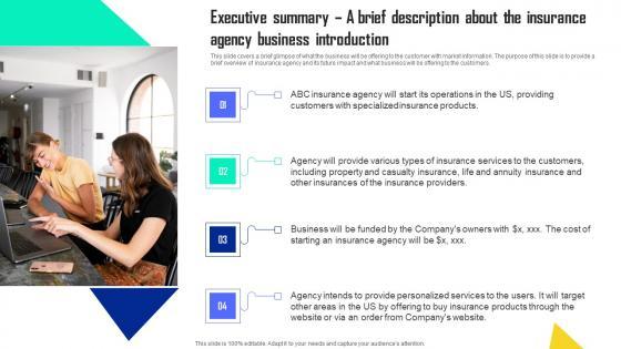 This slide covers a brief glimpse of what the business will be offering to the customer with market information. The purpose of this slide is to provide a brief overview of insurance agency and its future impact and what business will be offering to the customers. Slidegeeks is here to make your presentations a breeze with Executive Summary A Brief Description About The Insurance Agency Assurant Insurance Agency Background Pdf With our easy-to-use and customizable templates, you can focus on delivering your ideas rather than worrying about formatting. With a variety of designs to choose from, you are sure to find one that suits your needs. And with animations and unique photos, illustrations, and fonts, you can make your presentation pop. So whether you are giving a sales pitch or presenting to the board, make sure to check out Slidegeeks first. This slide covers a brief glimpse of what the business will be offering to the customer with market information. The purpose of this slide is to provide a brief overview of insurance agency and its future impact and what business will be offering to the customers.