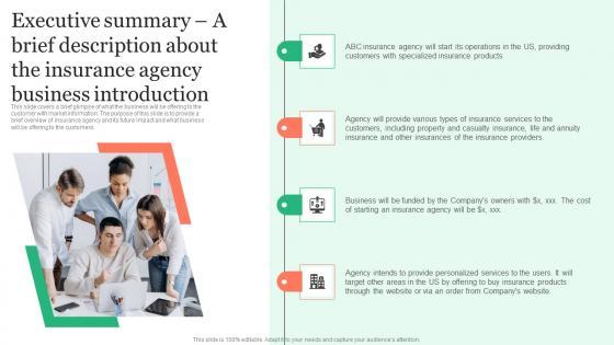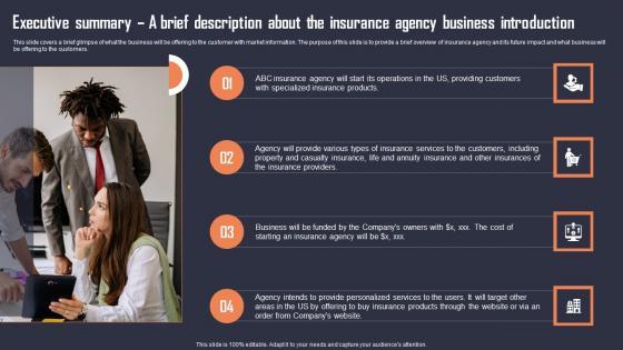 This slide covers a brief glimpse of what the business will be offering to the customer with market information. The purpose of this slide is to provide a brief overview of insurance agency and its future impact and what business will be offering to the customers.Slidegeeks is here to make your presentations a breeze with Executive Summary A Brief Description About The Insurance Broker Business Plan Guidelines Pdf With our easy-to-use and customizable templates, you can focus on delivering your ideas rather than worrying about formatting. With a variety of designs to choose from, you are sure to find one that suits your needs. And with animations and unique photos, illustrations, and fonts, you can make your presentation pop. So whether you are giving a sales pitch or presenting to the board, make sure to check out Slidegeeks first. This slide covers a brief glimpse of what the business will be offering to the customer with market information. The purpose of this slide is to provide a brief overview of insurance agency and its future impact and what business will be offering to the customers.