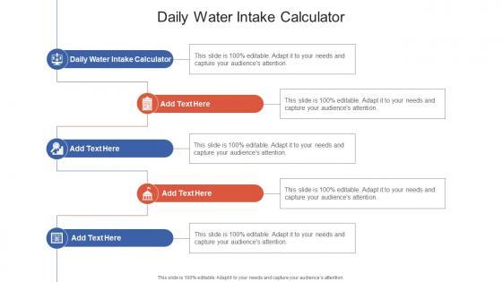 Introducing our well designed Daily Water Intake Calculator In Powerpoint And Google Slides Cpb. This PowerPoint design presents information on topics like Daily Water Intake Calculator. As it is predesigned it helps boost your confidence level. It also makes you a better presenter because of its high quality content and graphics. This PPT layout can be downloaded and used in different formats like PDF, PNG, and JPG. Not only this, it is available in both Standard Screen and Widescreen aspect ratios for your convenience. Therefore, click on the download button now to persuade and impress your audience. Our Daily Water Intake Calculator In Powerpoint And Google Slides Cpb are topically designed to provide an attractive backdrop to any subject. Use them to look like a presentation pro.