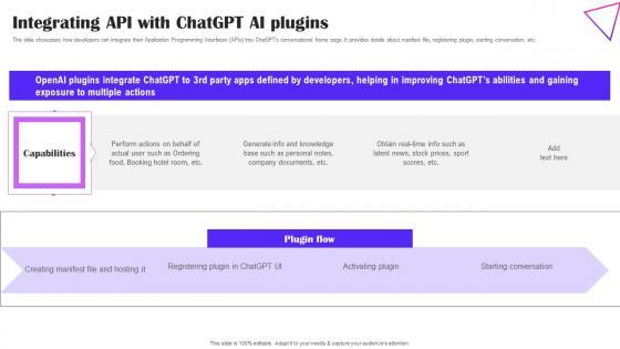 This slide showcases how developers can integrate their Application Programming Interfaces APIs into ChatGPTs conversational home page. It provides details about manifest file, registering plugin, starting conversation, etc. If your project calls for a presentation, then Slidegeeks is your go-to partner because we have professionally designed, easy-to-edit templates that are perfect for any presentation. After downloading, you can easily edit Integrating API With ChatGPT AI Plugins Creative Applications For Open AI Template Pdf and make the changes accordingly. You can rearrange slides or fill them with different images. Check out all the handy templates This slide showcases how developers can integrate their Application Programming Interfaces APIs into ChatGPTs conversational home page. It provides details about manifest file, registering plugin, starting conversation, etc.