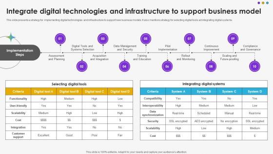 This slide presents a strategy for implementing digital technologies and infrastructure to support new business models. It also mentions strategy for selecting digital tools ad integrating digital systems.Find highly impressive Integrate Digital Technologies And Infrastructure To Support Business Model DT SS V on Slidegeeks to deliver a meaningful presentation. You can save an ample amount of time using these presentation templates. No need to worry to prepare everything from scratch because Slidegeeks experts have already done a huge research and work for you. You need to download Integrate Digital Technologies And Infrastructure To Support Business Model DT SS V for your upcoming presentation. All the presentation templates are 100 percent editable and you can change the color and personalize the content accordingly. Download now This slide presents a strategy for implementing digital technologies and infrastructure to support new business models. It also mentions strategy for selecting digital tools ad integrating digital systems.