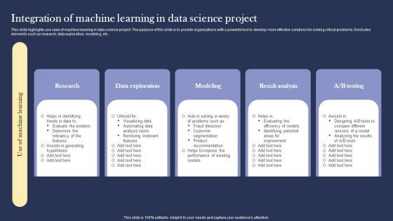 This slide highlights use case of machine learning in data science project. The purpose of this slide is to provide organizations with a powerful tool to develop more effective solutions for solving critical problems. It includes elements such as research, data exploration, modeling, etc. Pitch your topic with ease and precision using this Integration Of Machine Learning In Data Science Project Rules pdf. This layout presents information on Research, Data Exploration, Modeling. It is also available for immediate download and adjustment. So, changes can be made in the color, design, graphics or any other component to create a unique layout. This slide highlights use case of machine learning in data science project. The purpose of this slide is to provide organizations with a powerful tool to develop more effective solutions for solving critical problems. It includes elements such as research, data exploration, modeling, etc.