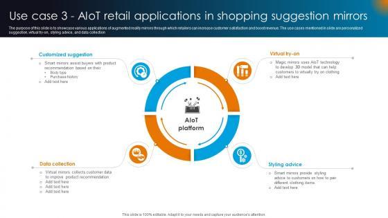 The purpose of this slide is to showcase various applications of augmented reality mirrors through which retailers can increase customer satisfaction and boost revenue. The use cases mentioned in slide are personalized suggestion, virtual try-on, styling advice, and data collection. Here you can discover an assortment of the finest PowerPoint and Google Slides templates. With these templates, you can create presentations for a variety of purposes while simultaneously providing your audience with an eye-catching visual experience. Download Integrating AI With IoT Use Case 3 AIoT Retail Applications In Shopping Suggestion Mirrors IoT SS V to deliver an impeccable presentation. These templates will make your job of preparing presentations much quicker, yet still, maintain a high level of quality. Slidegeeks has experienced researchers who prepare these templates and write high-quality content for you. Later on, you can personalize the content by editing the Integrating AI With IoT Use Case 3 AIoT Retail Applications In Shopping Suggestion Mirrors IoT SS V. The purpose of this slide is to showcase various applications of augmented reality mirrors through which retailers can increase customer satisfaction and boost revenue. The use cases mentioned in slide are personalized suggestion, virtual try-on, styling advice, and data collection.