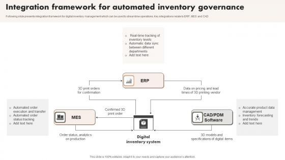 Following slide presents integration framework for digital inventory management which can be used to streamline operations. Key integrations relate to ERP, MES and CAD Showcasing this set of slides titled Integration Framework For Automated Inventory Governance Topics Pdf. The topics addressed in these templates are Departments, Printing Vendor, Forecasting . All the content presented in this PPT design is completely editable. Download it and make adjustments in color, background, font etc. as per your unique business setting. Following slide presents integration framework for digital inventory management which can be used to streamline operations. Key integrations relate to ERP, MES and CAD