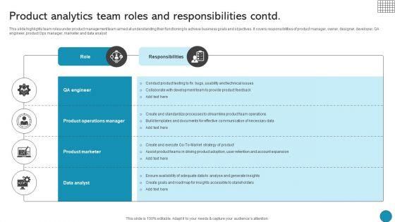 This slide highlights team roles under product management team aimed at understanding their functioning to achieve business goals and objectives. It covers responsibilities of product manager, owner, designer, developer, QA engineer, product Ops manager, marketer and data analyst Present like a pro with Product Analytics Team Roles And Responsibilities Driving Business Success Integrating Product. Create beautiful presentations together with your team, using our easy-to-use presentation slides. Share your ideas in real-time and make changes on the fly by downloading our templates. So whether you are in the office, on the go, or in a remote location, you can stay in sync with your team and present your ideas with confidence. With Slidegeeks presentation got a whole lot easier. Grab these presentations today. This slide highlights team roles under product management team aimed at understanding their functioning to achieve business goals and objectives. It covers responsibilities of product manager, owner, designer, developer, QA engineer, product Ops manager, marketer and data analyst
