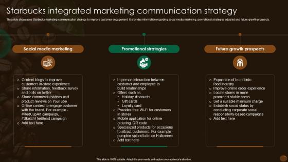 This slide showcases Starbucks marketing communication strategy to improve customer engagement. It provides information regarding social media marketing, promotional strategies adopted and future growth prospects. Want to ace your presentation in front of a live audience Our Starbucks Integrated Marketing Communication Strategy Ppt Powerpoint SS can help you do that by engaging all the users towards you. Slidegeeks experts have put their efforts and expertise into creating these impeccable powerpoint presentations so that you can communicate your ideas clearly. Moreover, all the templates are customizable, and easy-to-edit and downloadable. Use these for both personal and commercial use. This slide showcases Starbucks marketing communication strategy to improve customer engagement. It provides information regarding social media marketing, promotional strategies adopted and future growth prospects.